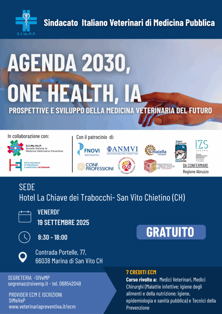 Il corso “Agenda 2030, One Health, IA: prospettive e sviluppo della medicina veterinaria del futuro” che si terrà a San Vito Chietino (CH) il 19 settembre, organizzato da SIVeMP, in collaborazione con SIMeVeP e ENPAV, con il patrocinio di FNOVI, ANMVI, ASL 2 Abruzzo, IZS Abruzzo e Molise, Parco Nazionale della Maiella-Maiella Geopark, CONFPROFESSIONI, mira ad accrescere la consapevolezza e l’importanza dell’adozione di un approccio inclusivo, indispensabile per rispondere efficacemente alle problematiche e alle minacce (già conosciute ed emergenti) causate dagli effetti della globalizzazione e del cambiamento climatico.