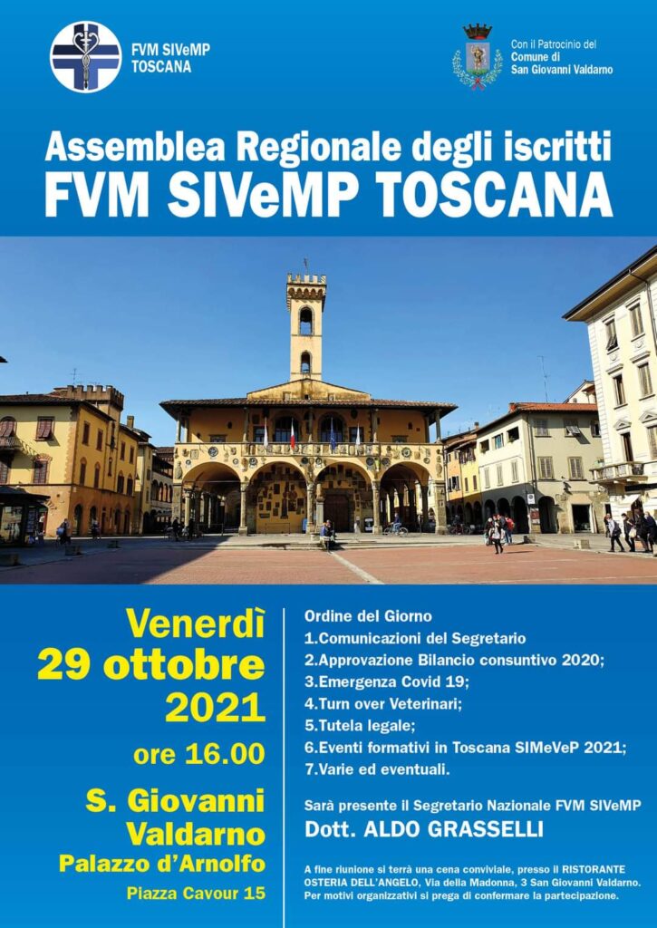Venerdì 29 ottobre a San Giovanni Val d’Arno (AR) alle ore 16 si terrà l’Assemblea Regionale degli iscritti FVM SIVeMP Toscana