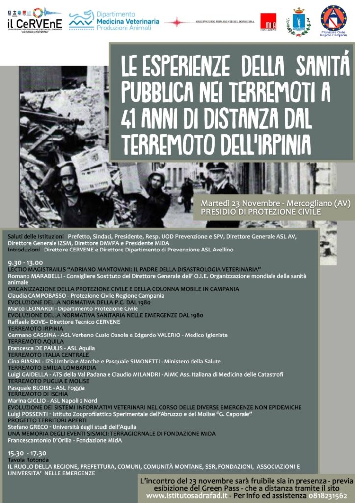 Quest’anno il ricordo, la commemorazione ma soprattutto il dibattito sulle calamità e le emergenze si terrà a Mercogliano in provincia di Avellino, con una serie di appuntamenti che inizieranno il 21 novembre con una giornata di formazione per i volontari di protezione civile e proseguirà la mattina del 23 Novembre con una sessione del Corso di formazione in “Sicurezza alimentare nelle emergenze” organizzato dall’Università Federico II di Napoli, e una tavola rotonda pomeridiana con la presenza delle Istituzioni locali.