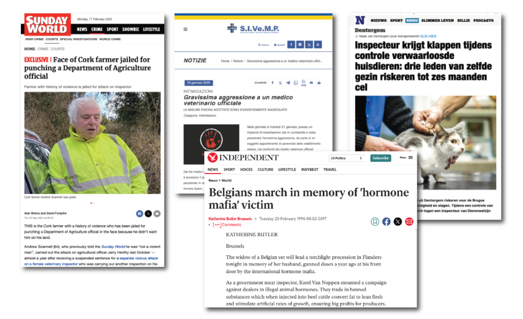 Nonostante i progressi degli ultimi 30 anni, le minacce per i veterinari ufficiali persistono. Proprio il mese scorso, un veterinario ufficiale italiano è stato brutalmente aggredito – strangolato e ripetutamente accoltellato – mentre effettuava un’ispezione in un macello. Mentre negli ultimi anni gli ispettori veterinari irlandesi sono stati ripetutamente aggrediti fisicamente da un allevatore, i funzionari pubblici norvegesi sono stati minacciati con un fucile durante le ispezioni sul benessere degli animali e un ispettore fiammingo è stato picchiato durante un’ispezione di animali da compagnia trascurati.