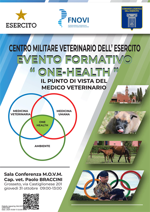 La Federazione Nazionale Ordine Veterinari Italiani (FNOVI) nel ruolo di Lead Organization e coordinatore scientifico dell’evento, in stretta collaborazione con il Centro Militare Veterinario dell’Esercito (in Grosseto) e il Nucleo Veterinario di Supporto Areale Nord dell’Esercito (in Padova) ha organizzato presso la storica sala conferenze “Cap. (vet) MOVM Paolo Braccini” del Centro Militare Veterinario, un evento formativo a favore degli Ufficiali veterinari e, in relazione al territorio nazionale, a favore di tutti i medici veterinari, provenienti da altre Forze Armate/Corpi Armati dello Stato, del SSN, del mondo accademico, ricercatori, liberi professionisti, comunque iscritti all’Ordine.