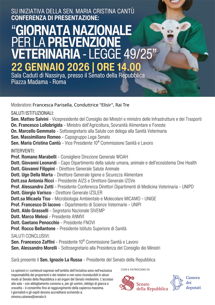 Si svolgerà oggi alle ore 14.00 in Senato la conferenza di presentazione della “Giornata nazionale per la Prevenzione Veterinaria – Legge 49/25” che si celebra il 25 gennaio, alla quale interverrà, fra gli altri il Segretario Nazionale del SIVeMP, Aldo Grasselli.