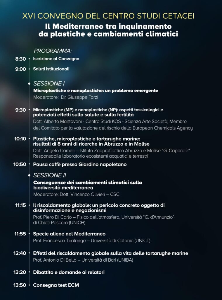 Un momento di confronto e aggiornamento scientifico sulle principali criticità che interessano il Mar Mediterraneo, con focus su inquinamento da plastiche e cambiamenti climatici, aperto a professionisti, studiosi e a chiunque sia interessato alla tutela dell’ecosistema marino.
